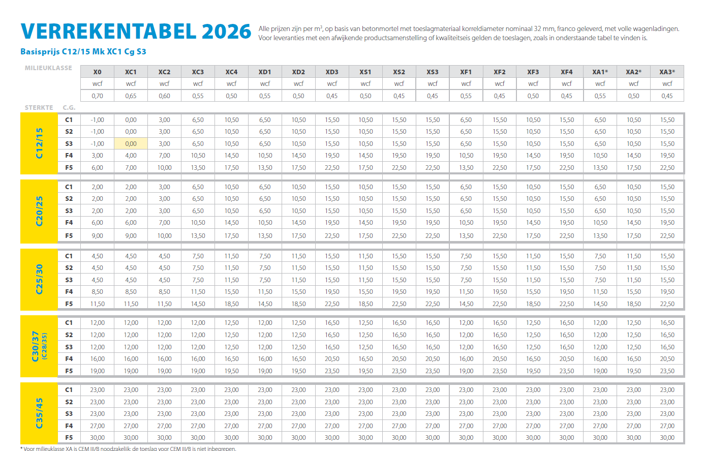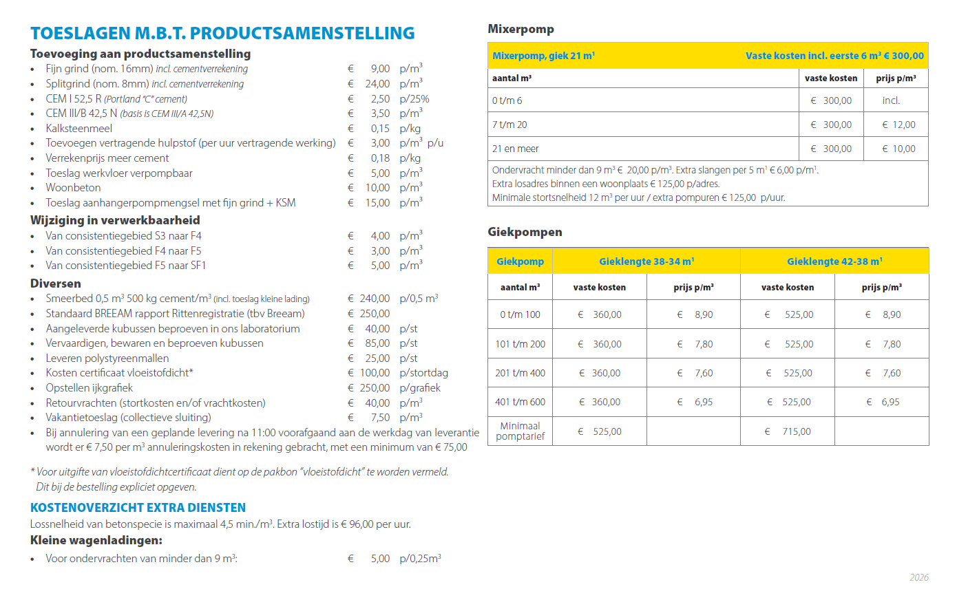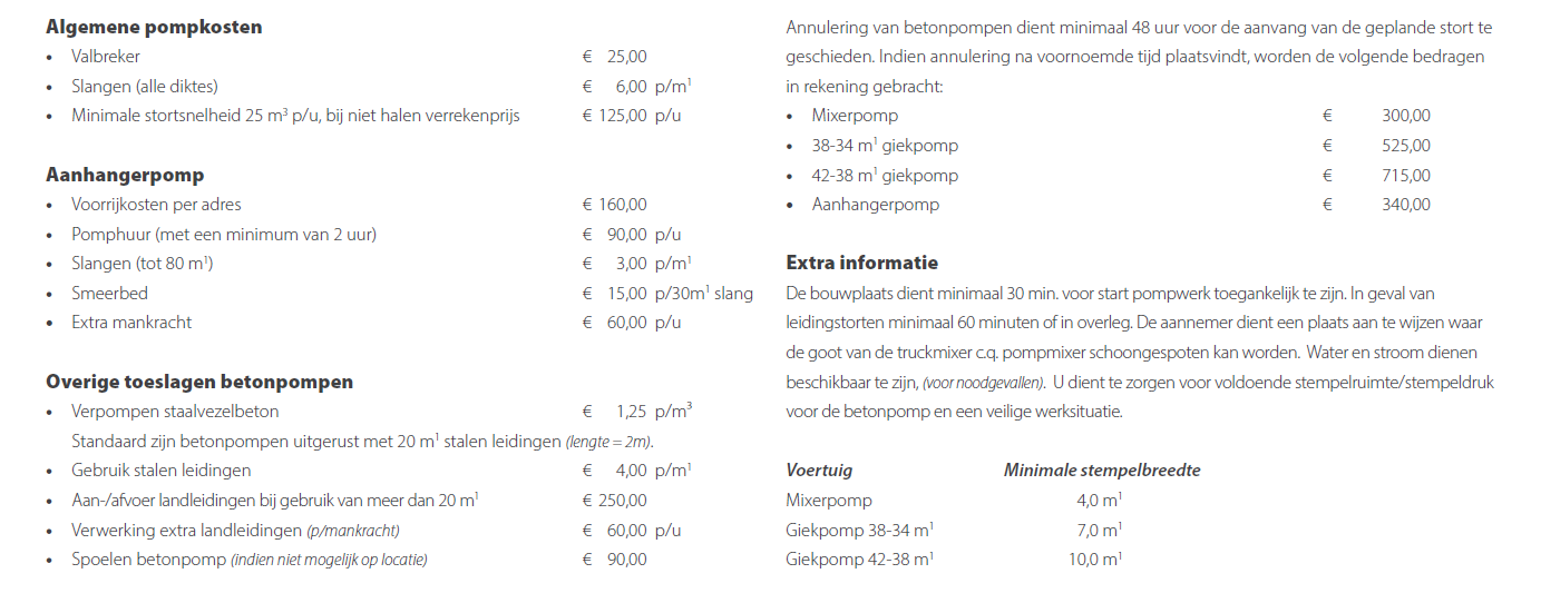 Hier vindt u diverse toeslagen voor specifieke eisen aan productsamenstellingen en een kostenoverzicht van extra te leveren diensten door Anker Beton.